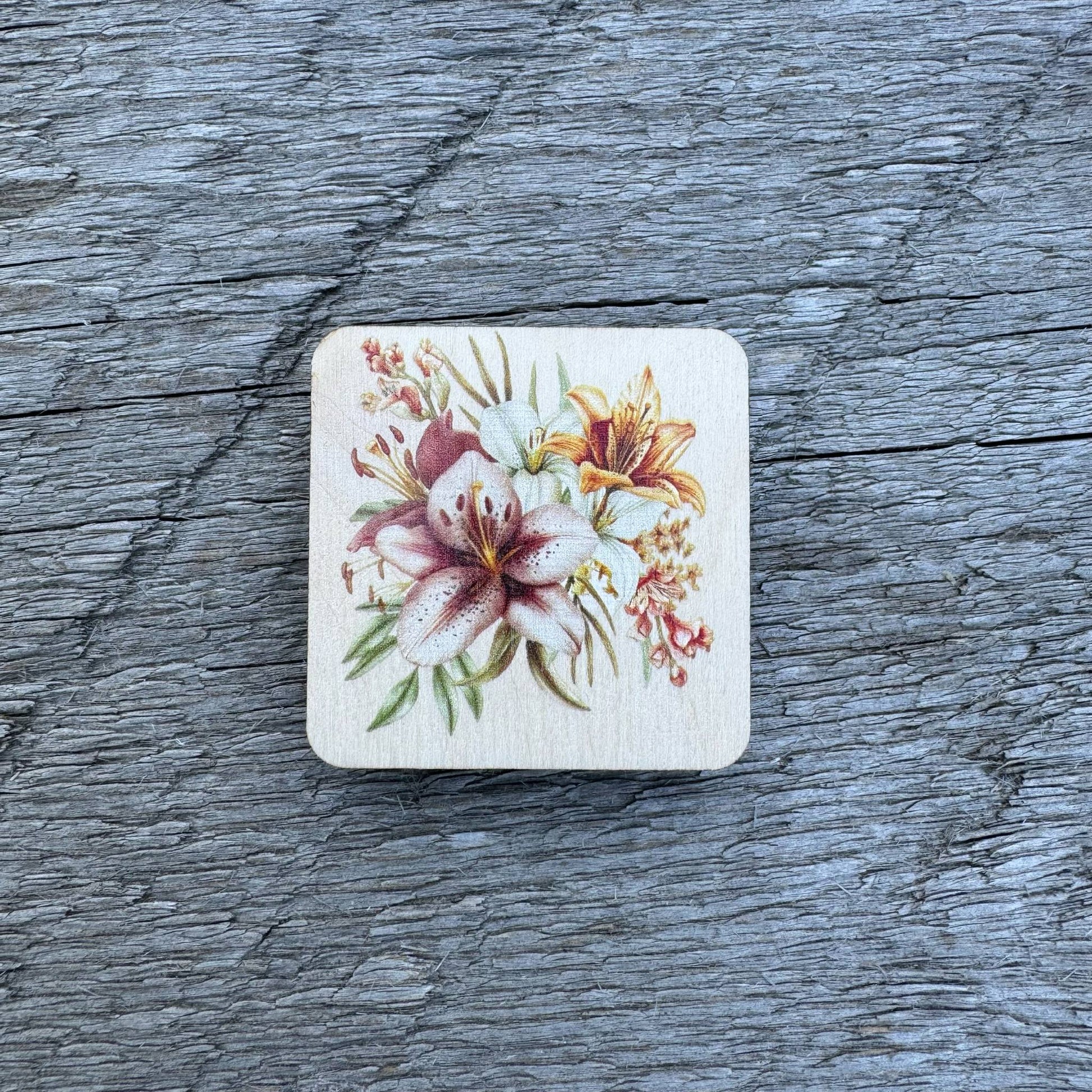 The wood magnet is cut out with our laser. The design is applied with our UV printer.