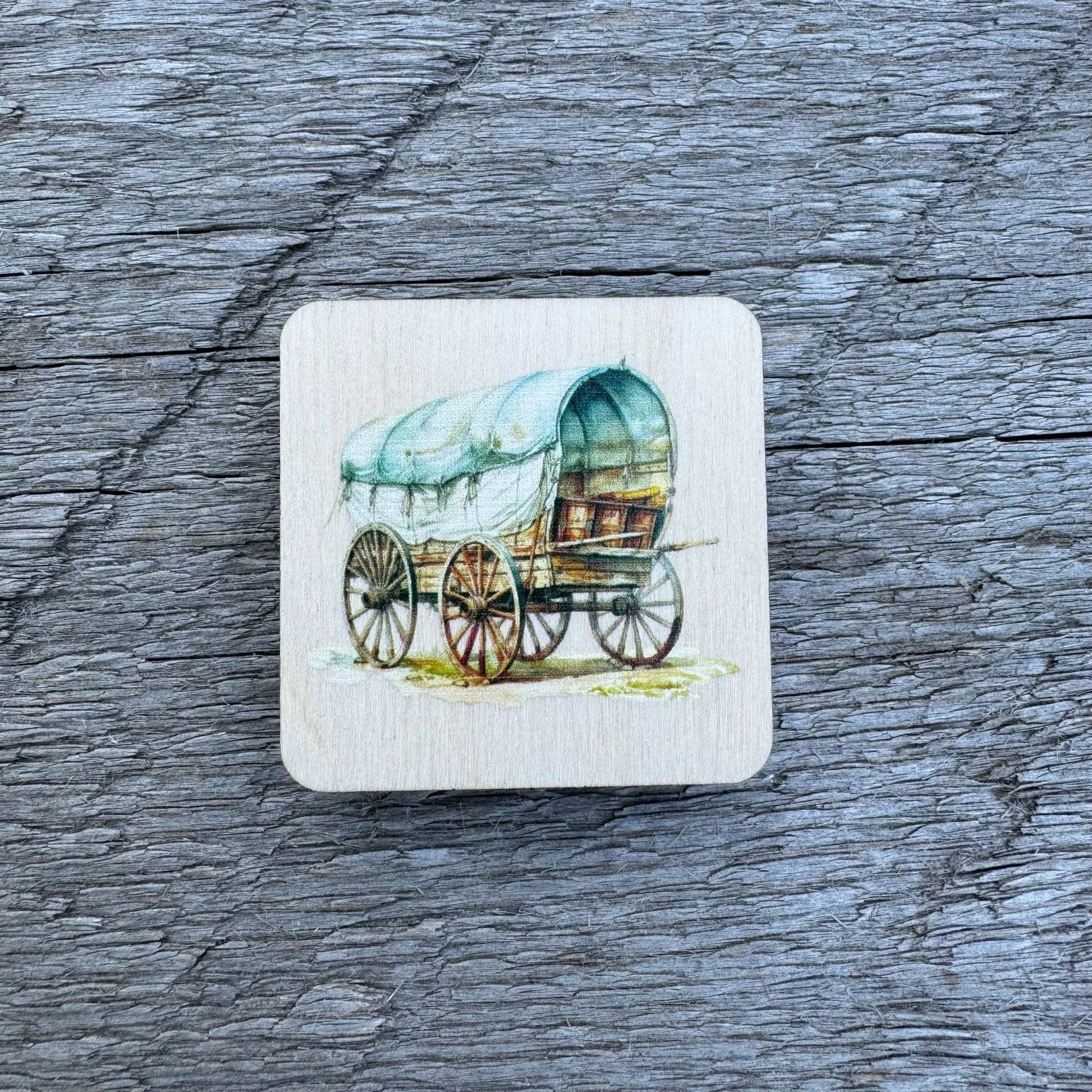 The wood magnet is cut out with our laser. The design is applied with our UV printer.