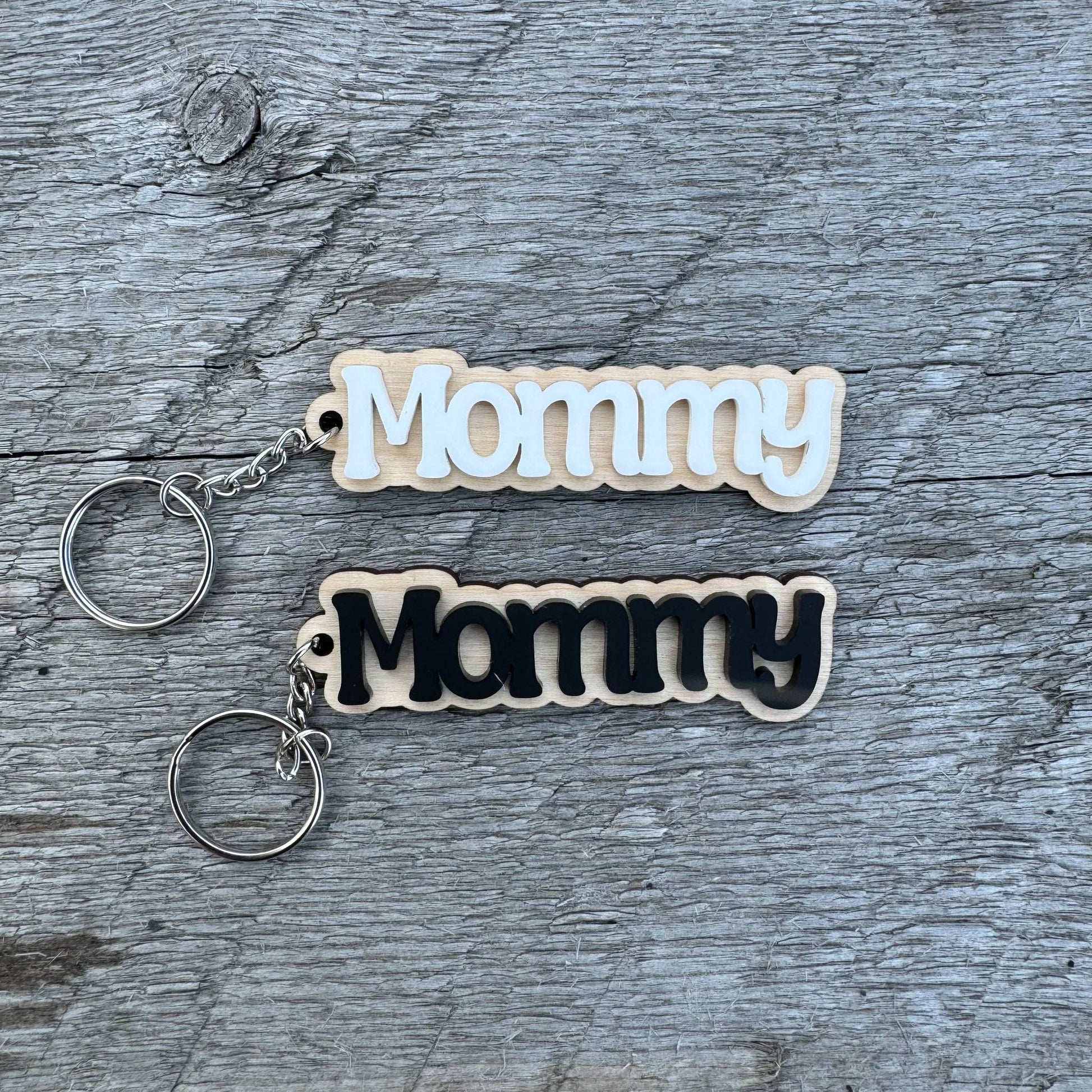 Our keychains are made with 1/8" birch plywood. The wording is laser engraved. A clear coat is applied onto the wood for protection. A keychain is attached onto the wood.