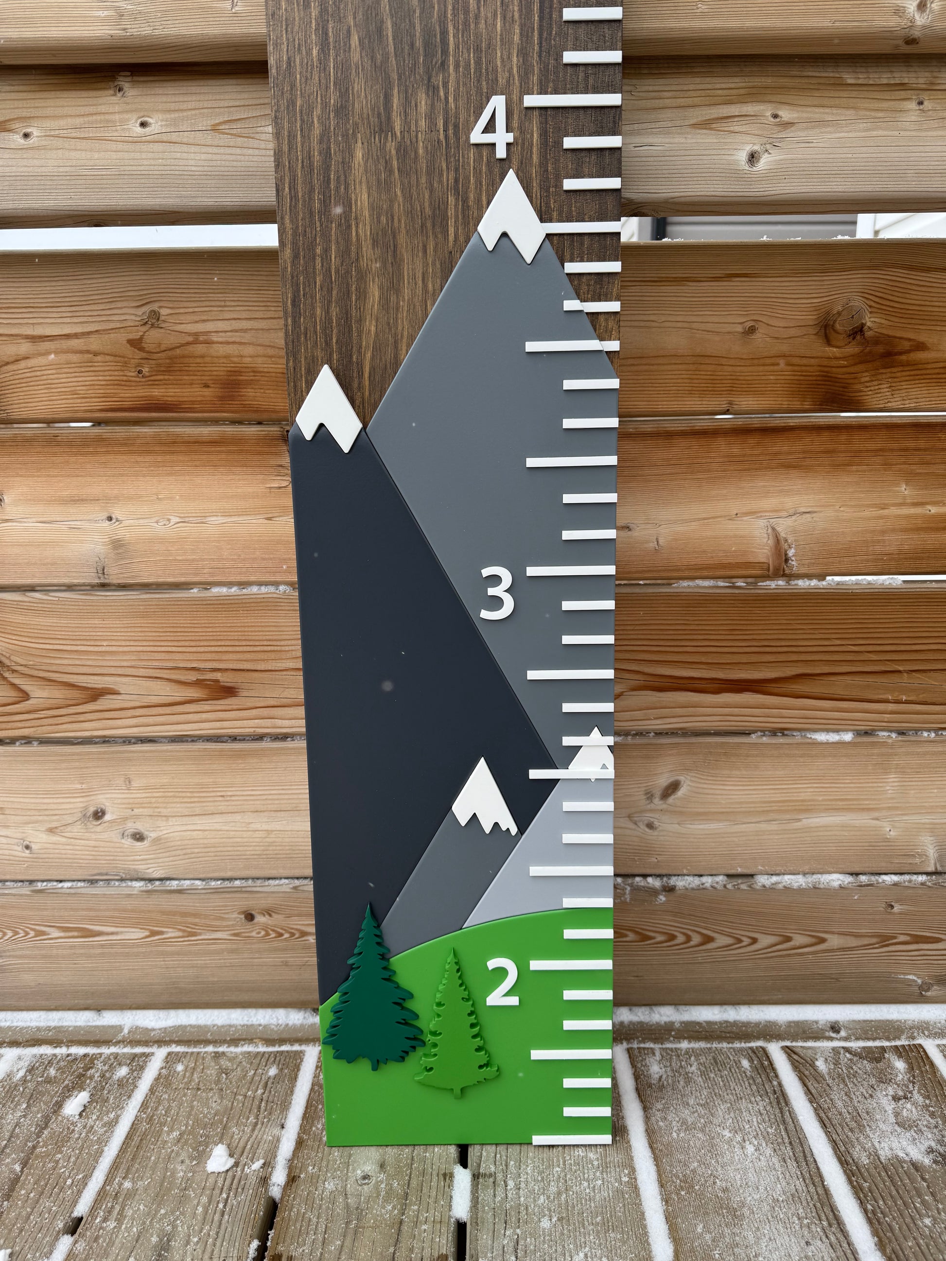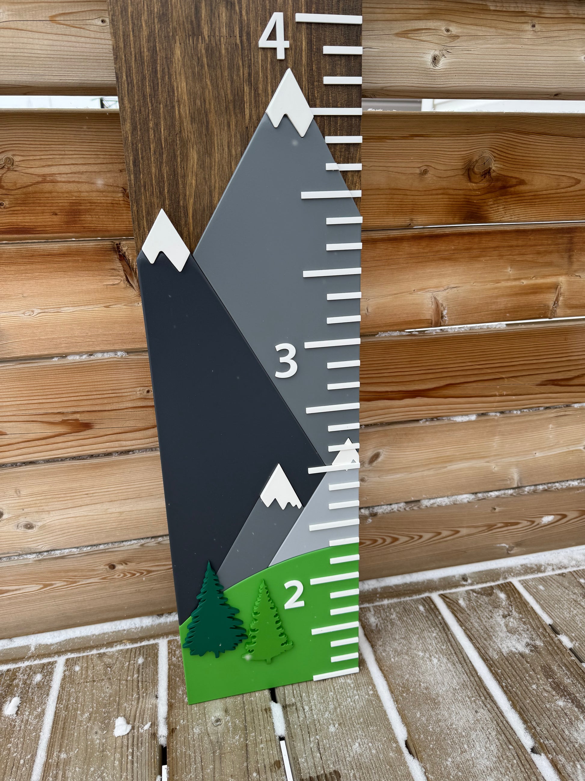 The growth chart be stained. The letters and design will be made from 1/8" matte black or white acrylic. The mountains are made from 1/8" and 1/4" MDF and are fully painted.